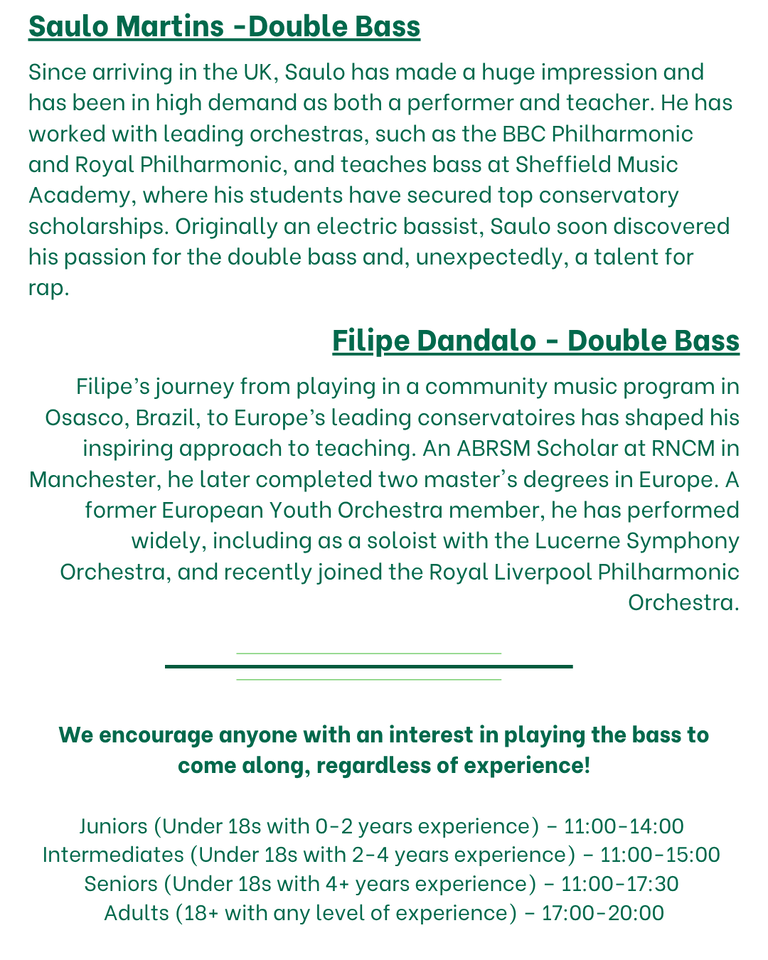 Our partners Sheffield Music Academy would like to welcome you to an inspiring day of music-making at their upcoming Bass Day on Saturday, 25th April. Designed for players aged 8–18 of all abilities, as well as complete beginners who are curious about taking up the double bass, this is a unique opportunity to develop your skills in a supportive and engaging environment.